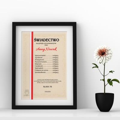 Jeśli chodzi o samo świadectwo, można na nim umieścić humorystyczne oceny, takie jak „cierpliwość – celujący” czy „poświęcenie – celujący”, oraz podziękowanie za trud i zaangażowanie. Oprawienie tego w klasyczną czarną ramkę nada prezentowi dodatkowej elegancji i sprawi, że będzie mógł zawisnąć na ścianie w klasie lub w domu nauczyciela.